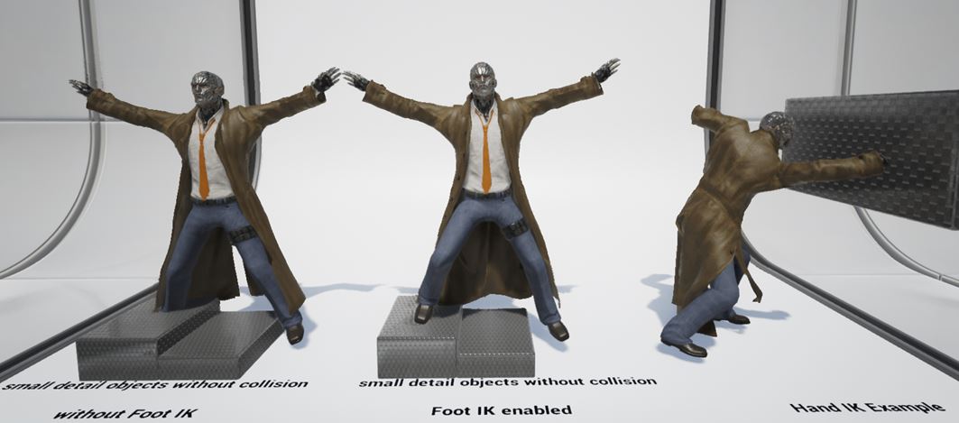 왼쪽의 캐릭터는 IK 셋업을 사용하지 않은 것이고, 중간은 IK 를 사용하여 충돌하는 오브젝트에 발을 딛고 있습니다. 오른쪽은 IK 를 사용하여 캐릭터의 주먹이 움직이는 블록에 닿을 때 애니메이션을 중지시키도록 하는 예제입니다.
